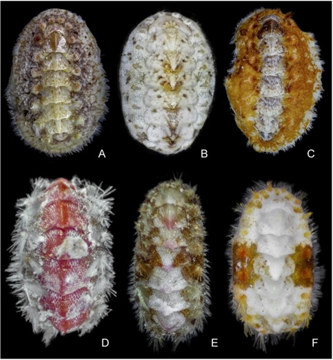 Các mẫu Acanthochitona hoàn chỉnh ở quần đảo Trường Sa nhìn từ mặt lưng. (A) và (C) loài Acanthochitona intermedia; (B) loài A. saitoi; (D), (E) và (F) loài A. spratlyenses Sirenko & Nguyen Tai, 2021
