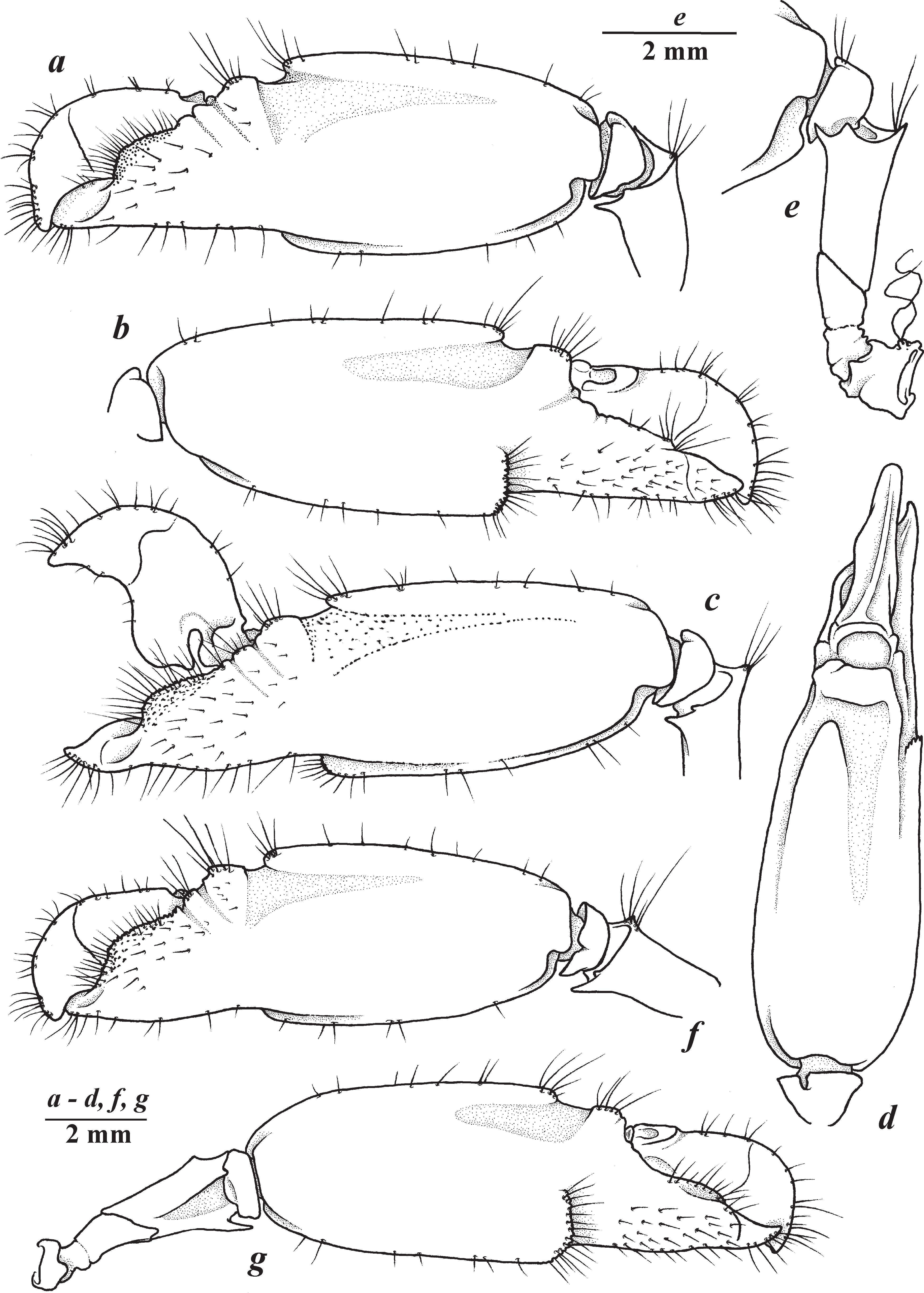 Hình 3: A. cangiopalus, càng (chela) lớn của cá thể đực (a-e) và cá thể cái (f, g): a-d, f, g - chela bên phải pereiopod I; e - các đốt khớp nối với chela.