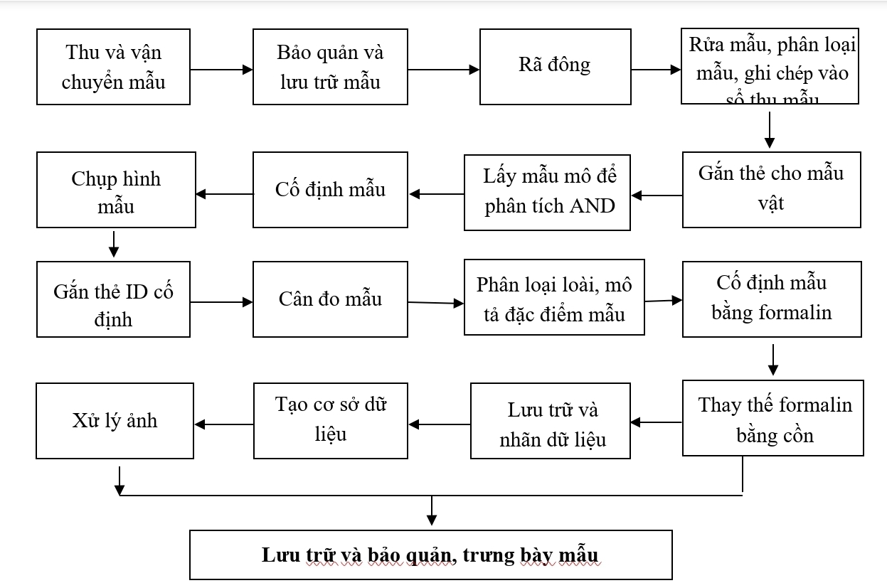 Hiện nhóm thực hiện đã xây dựng được kỹ thuật bảo quản cho từng nhóm đối tượng mẫu: cá, giáp xác, động vật thân mềm, san hô với 17 bước cụ thể theo sơ đồ sau: