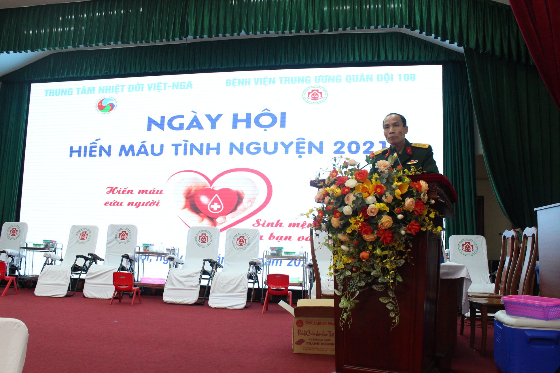 Đại tá Nguyễn Khắc Thăng, Chủ nhiệm Chính trị Trung tâm Nhiệt đới Việt-Nga phát biểu tại ngày hội hiến máu.