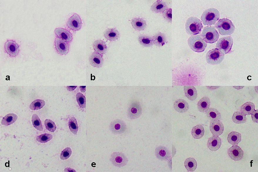 Tế bào hồng cầu một số loài cá. a – Cá đối Mugilidae sp. (L1.4), b – Cá nục Decapterus sp. (L1.4), c – Cá mú hoa Epinephelus fuscoguttatus (L2.1), d – Cá nâu bông Scatophagus argus (L3.4), e – Cá bò da Aluterus monoceros (L3.6), f – Cá chim trắng Pampus argenteus (L3.6)