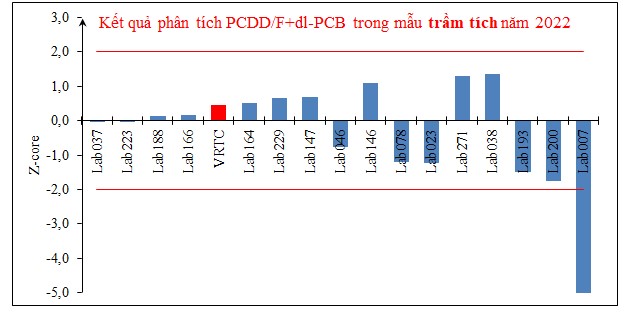 Giá trị z-core khi phân tích dioxin/furan và dl-PCB trong các nền mẫu khác nhau của Phân viện Hóa-Môi trường trong 3 năm gần đây (từ năm 2020 đến năm 2022) được trình bày trong bảng sau: