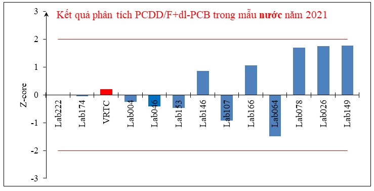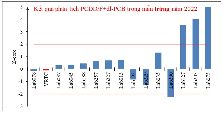 Qua bảng tổng hợp ở trên cho thấy, trong giai đoạn 2020-2022, kết quả phân tích dioxin/furan của Phân viện Hóa-Môi trường có 100% số mẫu đạt yêu cầu, trong đó có 60% số mẫu (12/20 mẫu) đạt kết quả xuất sắc. Tương tự đối với kết quả phân tích dl-PCB, có 100% số mẫu đạt yêu cầu, trong đó có 75% số mẫu (15/20 mẫu) đạt kết quả xuất sắc. Riêng tổng PCDD/PCDF+dl-PCB, tất cả các mẫu có giá trị z-core đạt yêu cầu, trong đó có 75% số mẫu đạt kết quả xuất sắc. Trong 2 năm gần nhất, Phân viện đạt kết quả xuất sắc khi phân tích dioxin/furan và dl-PCB trong cả 4 nền mẫu, trong đó có nền mẫu khó như mẫu thực phẩm và nước. Năm 2022, Phân viện Hóa-Môi trường được đánh giá là một trong 10 PTN có kết quả có độ đúng và độ lặp tốt nhất trong tất cả nền mẫu, trong đó kết quả phân tích dioxin/furan+dl-PCB trong mẫu trứng có giá trị z-core đứng thứ 2 trong số các PTN báo cáo kết quả.