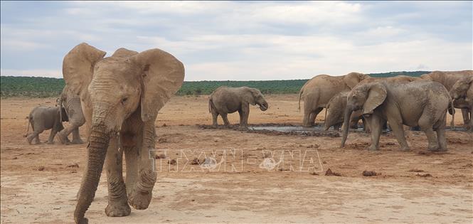 Một chú voi đi theo tiếng gọi của đàn tại Công viên bảo tồn voi quốc gia Addo (Nam Phi). Ảnh: Hồng Minh/Pv TTXVN tại Pretoria, Nam Phi.