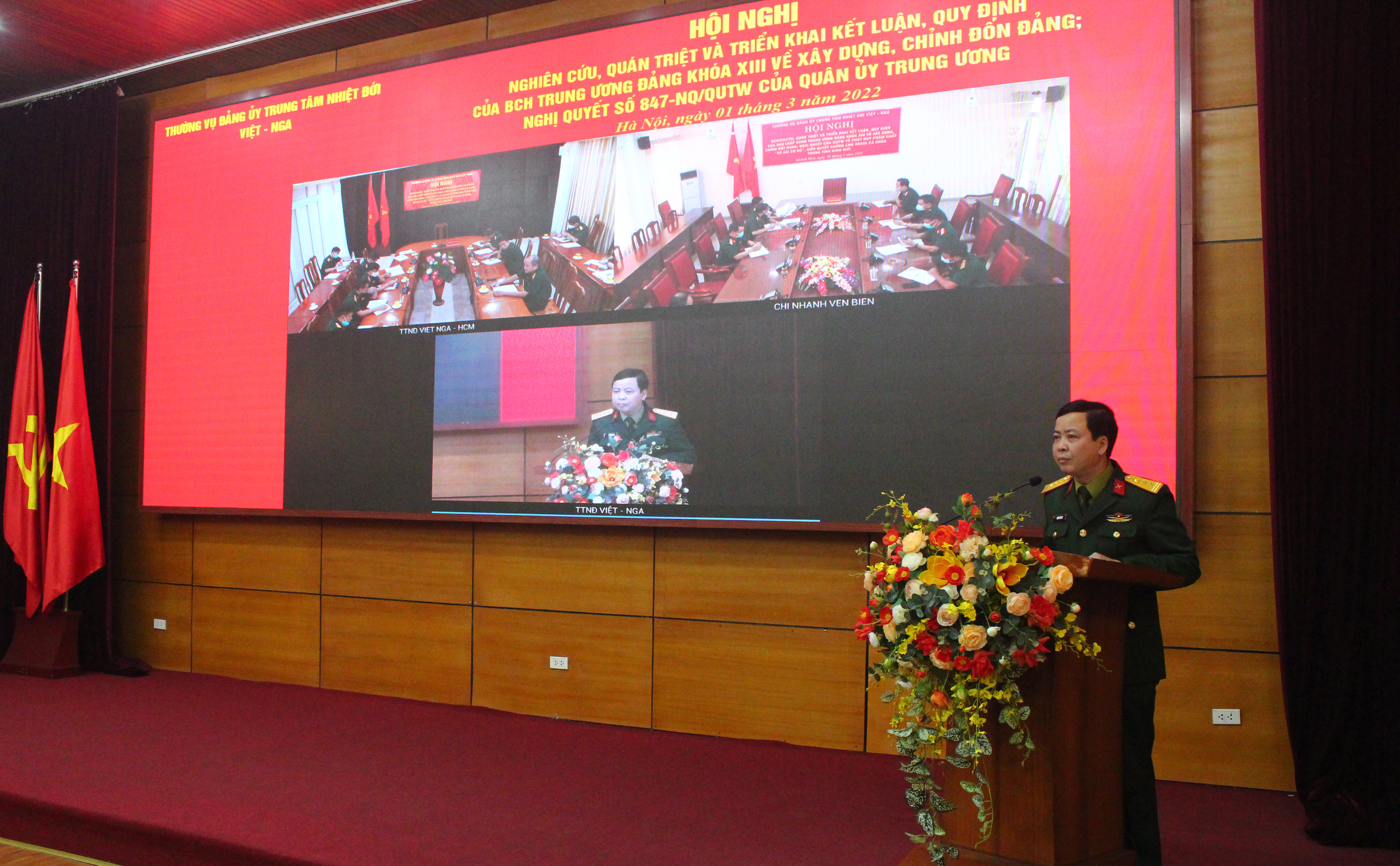 01/03/2022Sáng ngày 01 tháng 3, Thường vụ Đảng ủy Trung tâm Nhiệt đới Việt - Nga tổ chức Hội nghị trực tuyến nghiên cứu, quán triệt, triển khai thực hiện Kết luận, Quy định của Ban Chấp hành Trung ương Đảng khóa XIII về công tác xây dựng, chỉnh đốn Đảng; Nghị quyết của Quân ủy Trung ương về phát huy phẩm chất “Bộ đội Cụ Hồ”, kiên quyết chống chủ nghĩa cá nhân trong tình hình mới cho các đồng chí cán bộ chủ chốt của Trung tâm. Đồng chí Đại tá Trần Văn Duy, Bí thư Đảng ủy, Phó Tổng Giám đốc Trung tâm chủ trì và trực tiếp quán triệt, triển khai các nội dung tại Hội nghị.