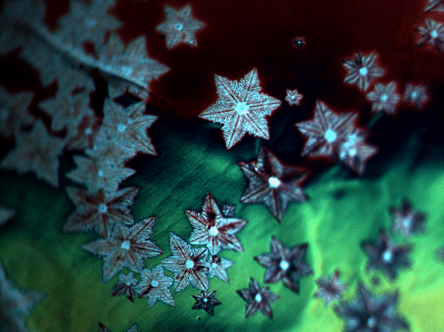 Hình ảnh các tinh thể khắc trên graphen trong phòng thí nghiệm của viện khoa học và công nghệ Skolkovo. Vùng sáng –graphen, vùng tối – Cu ở dạng oxi hoá. Hình ảnh được tạo ra do một phần graphen bị ăn mòn bởi khi CO trong thí nghiệm khi chưa tìm ra tỉ lệ khí tối ưu