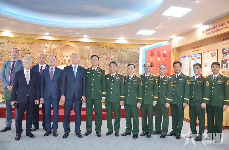 Thượng tướng Nguyễn Trường Thắng và Trợ lý Tổng thống, Chủ tịch Hội đồng Biển LB Nga Nikolai Patrushev cùng các đại biểu tham quan Nhà truyền thống Trung tâm Nhiệt đới Việt-Nga.