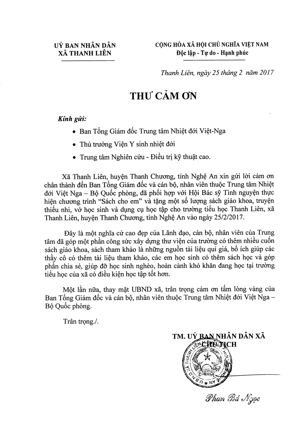 02/03/2017Hưởng ứng phong trào chung sức vì cộng đồng số 13 và Chương trình kỷ niệm 62 năm ngày Thầy thuốc Việt Nam (27/02/1955 – 27/02/2017) của Hội Bác sỹ tình nguyện Việt Nam về việc khám bệnh nhân đạo, tư vấn sức khỏe, cấp thuốc không phí và tặng quà cho 400 hộ dân (thuộc hộ nghèo và đối tượng chính sách), tặng trang thiết bị cho trạm y tế, xây dựng tủ sách, truyện cho trường Mầm non Thanh Liên, Trường Tiểu học Thanh Liên tại xã Thanh Liên, huyện Thanh Chương, tỉnh Nghệ An; Thực hiện ý kiến của Ban Tổng Giám đốc Trung tâm Nhiệt đới Việt – Nga, Phòng Chính trị đã chỉ đạo các tổ chức quần chúng: Đoàn Thanh niên, Hội Phụ nữ, Công đoàn tại Cơ sở chính phát động phong trào quyên góp sách giáo khoa, truyện tranh thiếu nhi, đồ dùng học tập, đồng thời phát huy tinh thần tự nguyện của cán bộ y, bác sỹ của Trung tâm điều trị kỹ thuật cao tham gia đoàn công tác thiện nguyện.
