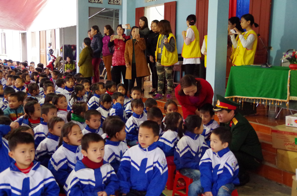 Trung tá Hoàng Đức Hậu, Giám đốc Trung tâm điều trị kỹ thuật cao tặng quà cho các em học sinh Trường tiểu học Thanh Liên