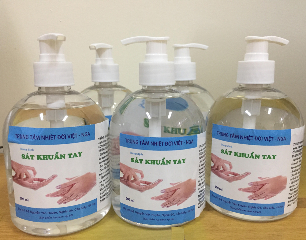 Dung dịch sát khuẩn tay do Trung tâm Nhiệt đới Việt – Nga sản xuất.