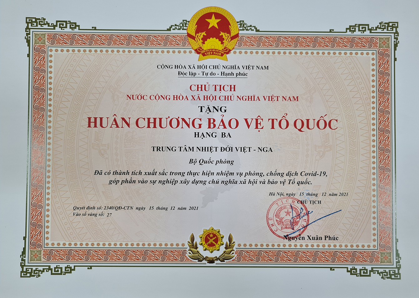 Trung tâm Nhiệt đới Việt - Nga được tặng Huân chương Bảo vệ Tổ quốc hạng Ba trong phòng, chống COVID-19.