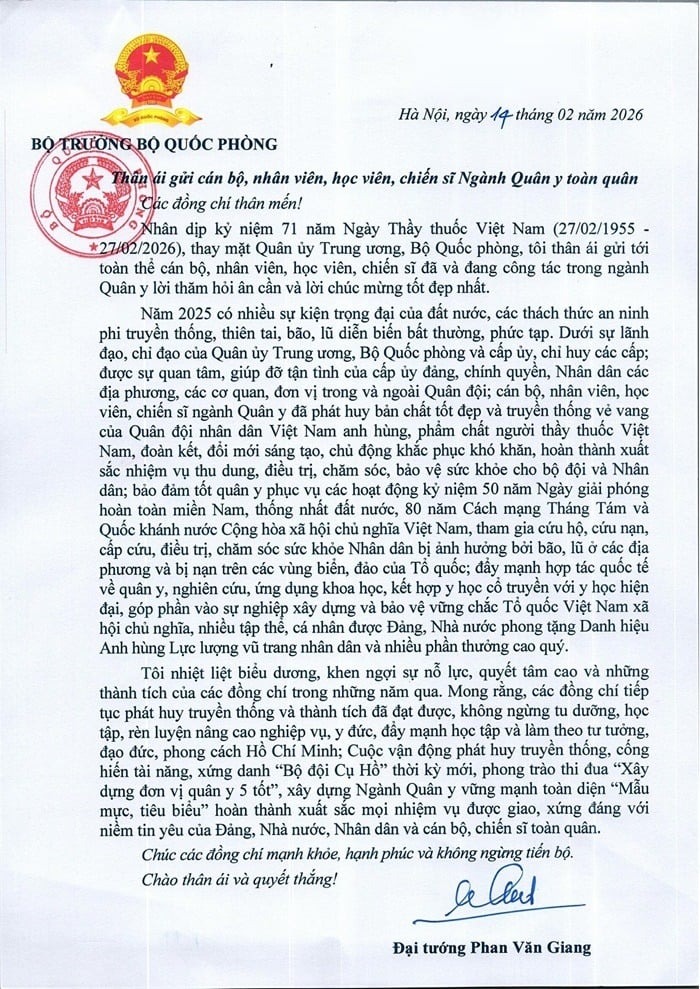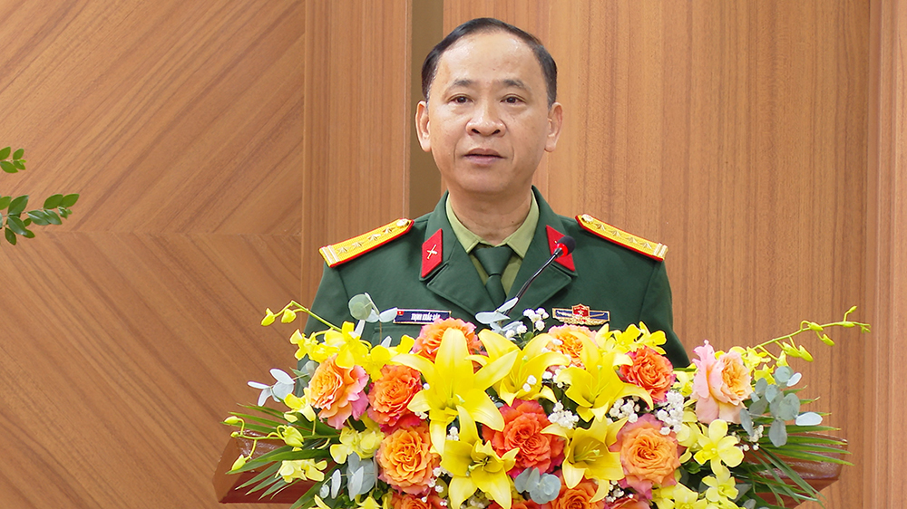 Đại tá Trịnh Khắc Sáu đọc thư của Đại tướng Phan Văn Giang, Ủy viên Bộ Chính trị, Phó Bí thư Quân ủy Trung ương, Bộ trưởng Bộ Quốc phòng gửi cán bộ, nhân viên, học viên, chiến sĩ ngành Quân y Quân đội nhân dân Việt Nam.