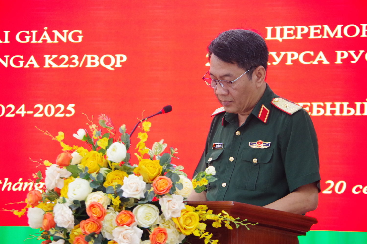 Khai mạc buổi lễ, đồng chí Đại tá Phạm Ngọc Quyền, Trưởng phòng Đào tạo cho biết, Lễ khai giảng Lớp bồi dưỡng tiếng Nga trình độ bậc 3 cho cán bộ, sĩ quan quân đội khóa 23 năm học 2024 - 2025 được diễn ra trong bối cảnh đặc biệt ý nghĩa, khi cả nước vừa long trọng kỷ niệm 79 năm Quốc khánh nước Cộng hòa xã hội chủ nghĩa Việt Nam và Trung tâm tổ chức thành công Đại hội thi đua Quyết thắng giai đoạn 2019-2024. Đồng thời, Phòng Đào tạo đã hoàn thành xuất sắc nhiệm vụ bồi dưỡng tiếng Nga cho 63 học viên là cán bộ, sĩ quan quân đội trong năm học 2023-2024.