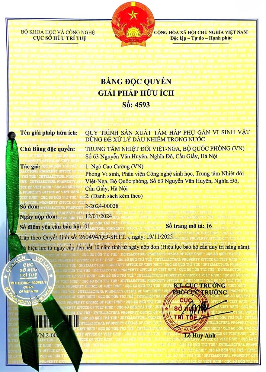 Ngày 19/11/2025, Cục Sở hữu trí tuệ đã cấp Bằng độc quyền Giải pháp hữu ích số 4593 cho công nghệ tấm vi sinh xử lý nước thải nhiễm dầu do Trung tâm Nhiệt đới Việt - Nga làm chủ. Đây không chỉ là sự ghi nhận về mặt khoa học - công nghệ, mà còn khẳng định năng lực làm chủ công nghệ xử lý nước thải nhiễm dầu bằng vi sinh của Trung tâm, mở ra khả năng ứng dụng rộng rãi tại các cầu rửa xe, trạm sửa chữa, kho xăng dầu và khu kỹ thuật trong và ngoài Quân đội.