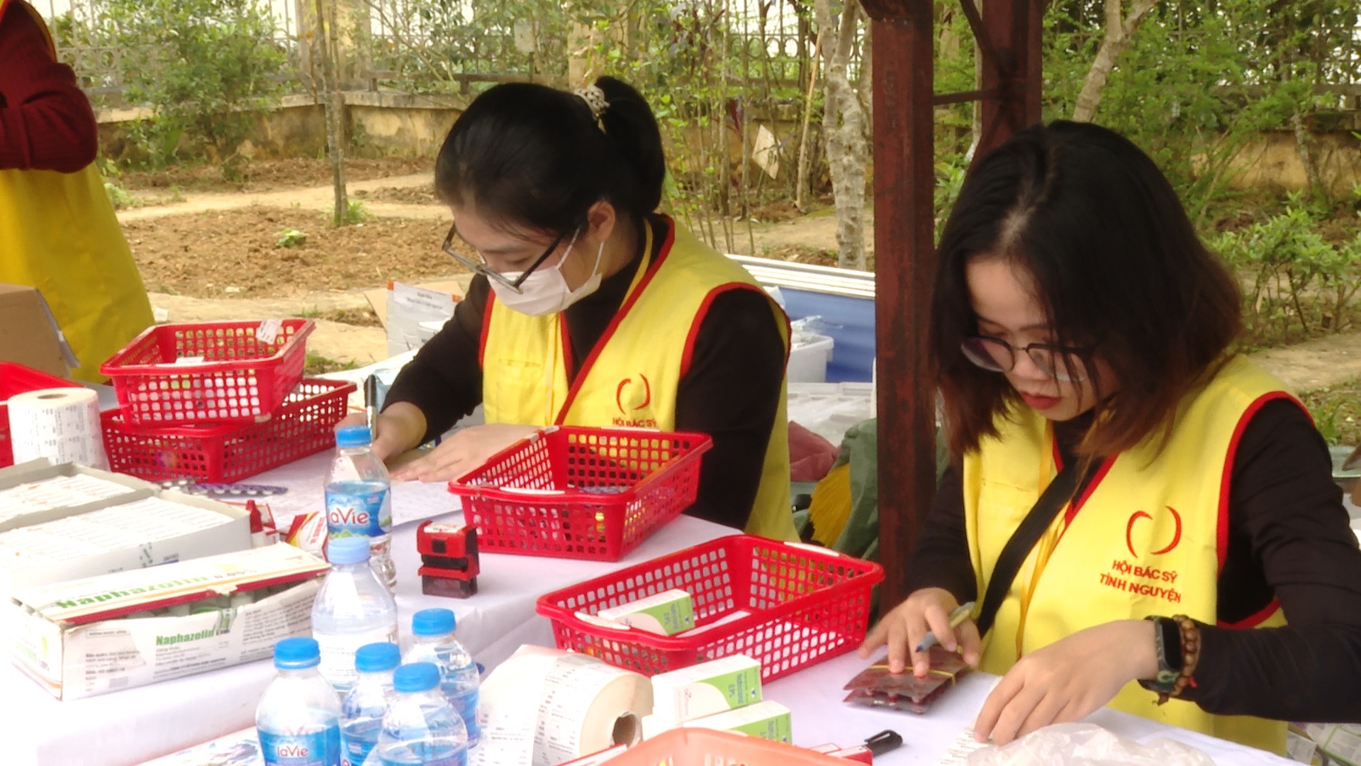 Đội ngũ y bác sỹ khám và cấp phát thuốc cho người dân xã Hoàng Thu Phố