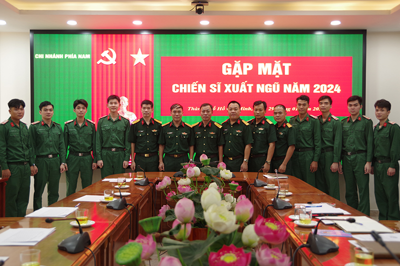 Đại tá Hoàng Hải Thụy, Bí thư Đảng ủy, Chính trị viên Chi nhánh Phía Nam chụp ảnh lưu niệm cùng các chiến sĩ.