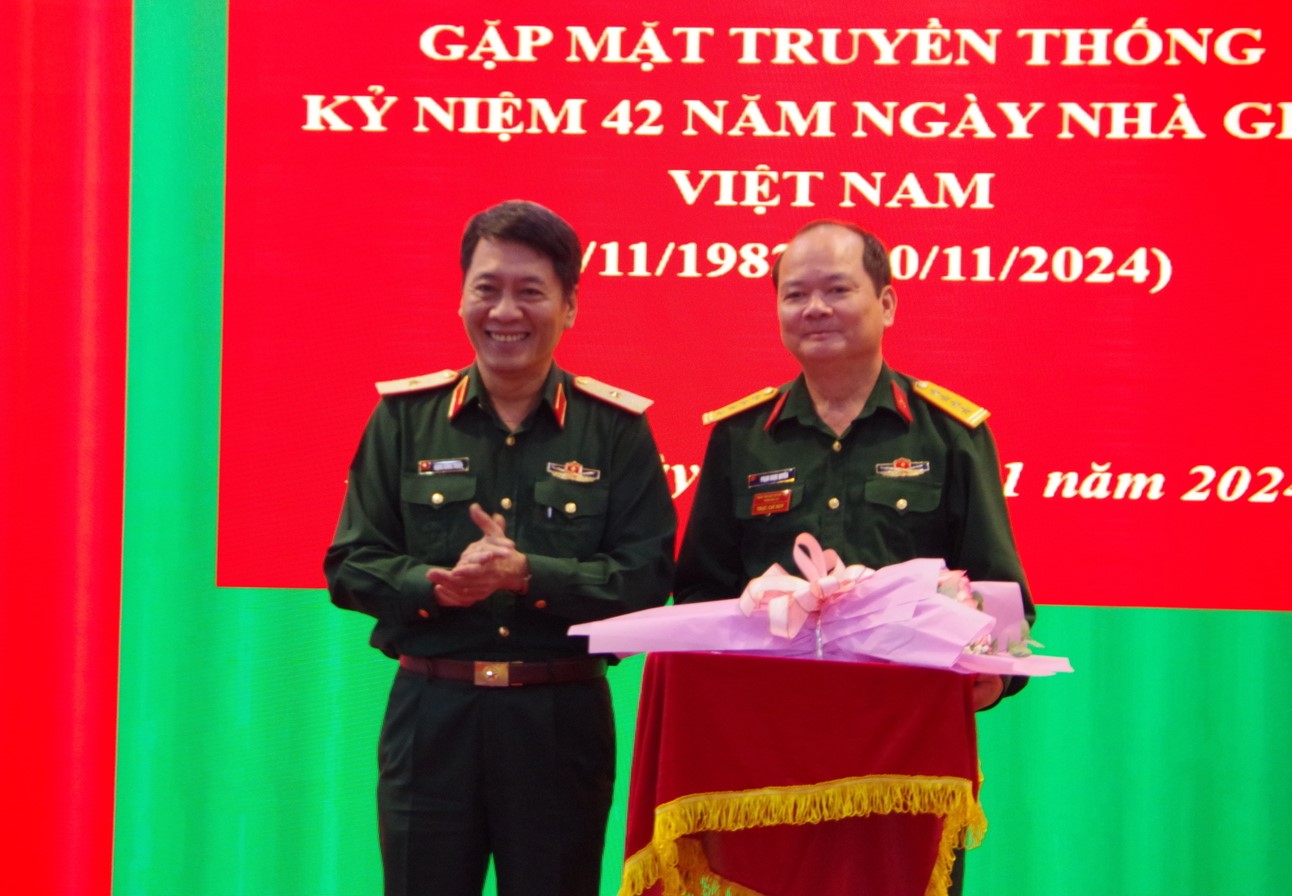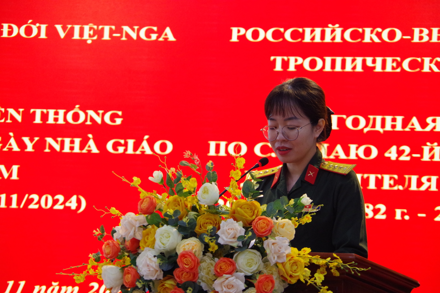 Mở đầu buổi gặp mặt, Đại tá Phạm Ngọc Quyền, Trưởng phòng Đào tạo đọc thư chúc mừng của Đại tướng Phan Văn Giang, Ủy viên Bộ Chính trị, Phó bí thư Quân ủy Trung ương, Bộ trưởng Bộ Quốc phòng chúc mừng các thế hệ nhà giáo, cán bộ quản lý giáo dục đã và đang công tác trong Quân đội và ôn lại lịch sử ra đời, ý nghĩa, truyền thống tốt đẹp của Ngày Nhà giáo Việt Nam.
