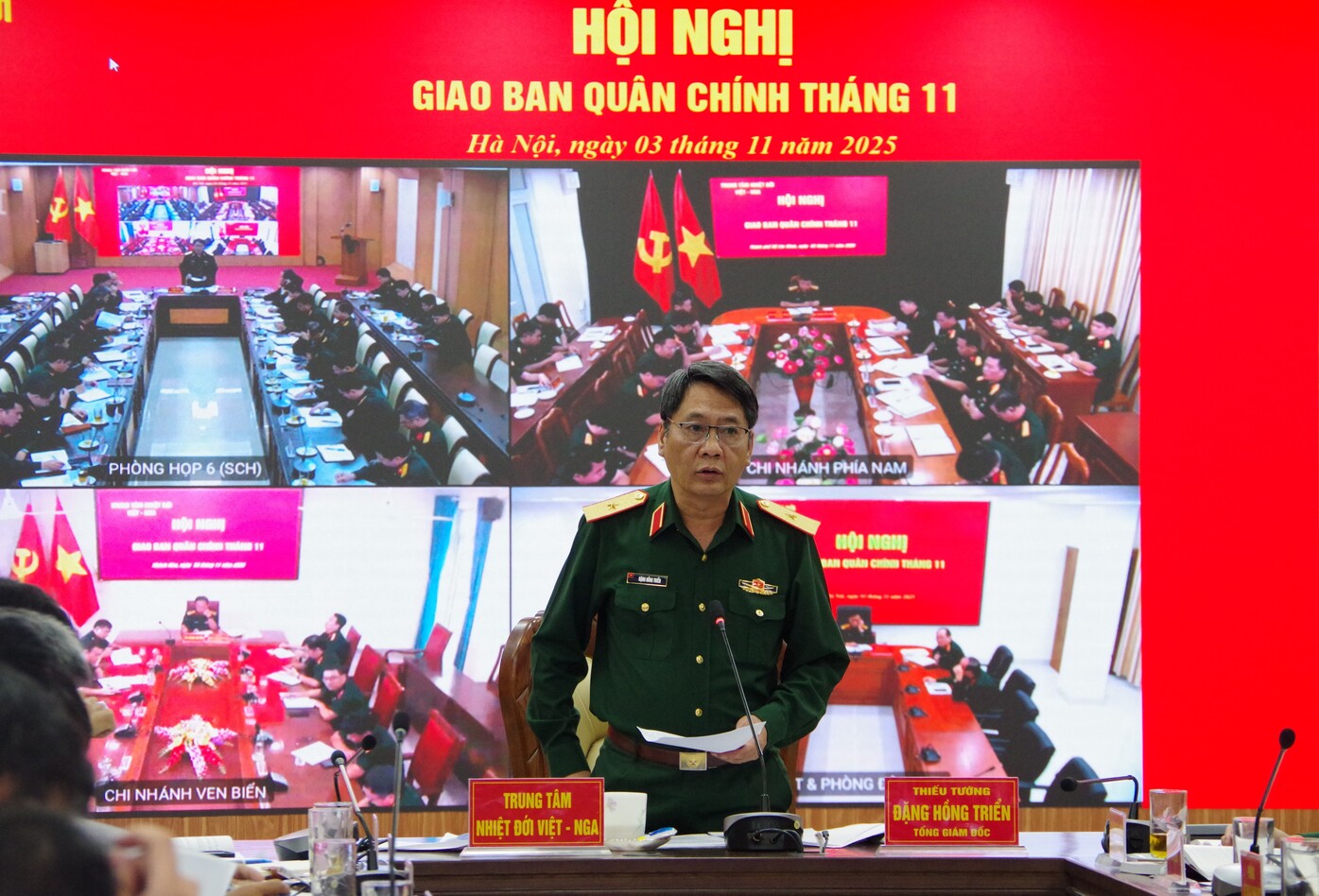 03/11/2025Sáng ngày 03/11, tại Hà Nội, Trung tâm Nhiệt đới Việt - Nga tổ chức Hội nghị giao ban Quân chính tháng 11. Đồng chí Thiếu tướng Đặng Hồng Triển, Tổng Giám đốc Trung tâm chủ trì Hội nghị. Tham dự Hội nghị có các đồng chí trong Ban Tổng Giám đốc; lãnh đạo, chỉ huy và cán bộ chủ chốt các cơ quan, đơn vị trực thuộc Trung tâm. Hội nghị được tổ chức trực tiếp tại Cơ sở chính kết hợp trực tuyến với các điểm cầu Chi nhánh Ven biển, Chi nhánh Phía Nam và Ban Quản lý các khu chế thử.