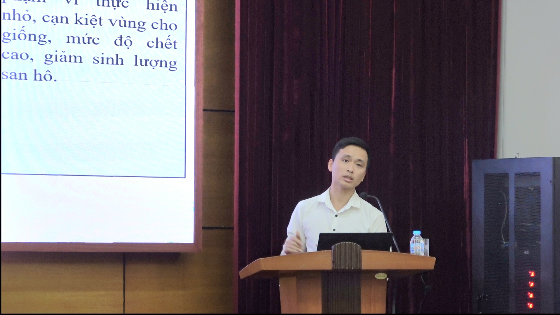 Tại Hội thảo, các đại biểu đã nghe đồng chí Phùng Văn Giỏi - Trợ lý nghiên cứu Phòng Sinh thái nước trình bày các nội dung: Tổng quan và đánh giá các phương pháp phục hồi san hô trên thế giới (bao gồm: phương pháp tăng cường giá thể, phương pháp sinh sản vô tính và phương pháp sinh sản hữu tính); tổng hợp các nhiệm vụ nghiên cứu, phục hồi ở Việt Nam; các tiêu chí lựa chọn và đề xuất phương pháp nghiên cứu.