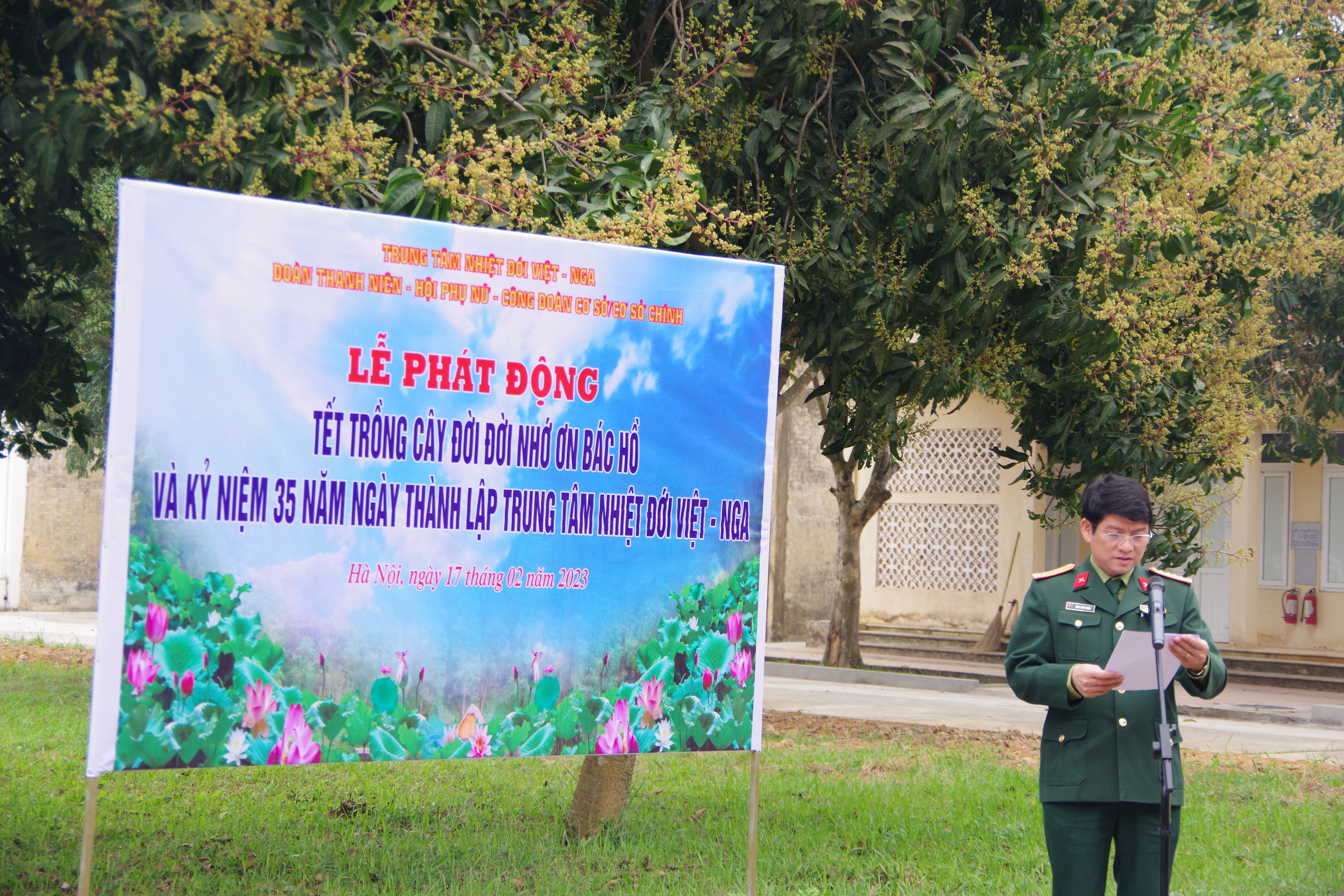 Là một trong các đơn vị nghiên cứu hàng đầu về bảo tồn, phát triển tài nguyên đa dạng sinh học theo chức năng, nhiệm vụ của Trung tâm Nhiệt đới Việt - Nga thì trồng cây, gây rừng chính là bảo vệ môi trường, bảo vệ sự sống của chúng ta cho hôm nay và mãi mãi muôn đời sau. Mặc dù các khu vực đóng quân của Trung tâm không rộng, không có nhiều diện tích để trồng cây nhưng những năm qua các đơn vị trong Trung tâm đã chủ động trồng nhiều cây xanh, cây cảnh, xây dựng môi trường xanh, sạch, đẹp, nhất là khu vực các Trạm thử nghiệm Hòa Lạc, Cần Giờ, Đầm Báy, các trạm quan trắc. Các tổ chức quần chúng của Trung tâm đã phối hợp với các đơn vị bạn như Bộ Tư lệnh Bảo vệ Lăng Chủ tịch Hồ Chí Minh, các học viện, nhà trường, các viện nghiên cứu và các bệnh viện Khu vực Hà Nội trồng hàng nghìn cây tại khu Di tích lịch sử K9 - Đá Chông. Đây là những hoạt động thiết thực, ý nghĩa thể hiện tình cảm, trách nhiệm của cán bộ, nhân viên Trung tâm với hoạt động phong trào trồng cây của Bác. Với tinh thần, ý nghĩa sâu sắc đó, đồng chí Phó Tổng Giám đốc Trung tâm kêu gọi các cán bộ, nhân viên trong Trung tâm hăng hái tham gia trồng cây, gây rừng, trồng cây ăn quả, cây lấy gỗ, lấy bóng mát phù hợp với điều kiện của đơn vị. Đồng chí cũng đề nghị cấp ủy, chỉ huy các cấp cần tuyên truyền sâu rộng bằng nhiều hình thức, biện pháp đến toàn thể cán bộ, công nhân viên, chiến sỹ, các tổ chức quần chúng và nhân dân về mục đích, ý nghĩa của Tết trồng cây; về vai trò, tác dụng to lớn, lợi ích toàn diện, lâu dài; giá trị nhân văn của việc trồng cây, trồng rừng; công tác bảo vệ rừng, bảo vệ môi trường sinh thái. Thay mặt Trạm Thử nghiệm Hòa lạc, đồng chí Thượng tá Nguyễn Việt Thắng, Trạm trưởng cũng đã hứa hẹn sẽ có trách nhiệm trong công tác bảo vệ và thường xuyên chăm sóc, vun trồng bảo đảm vườn cây sinh trưởng và phát triển cao lớn, xanh tươi, đơm hoa, kết trái.