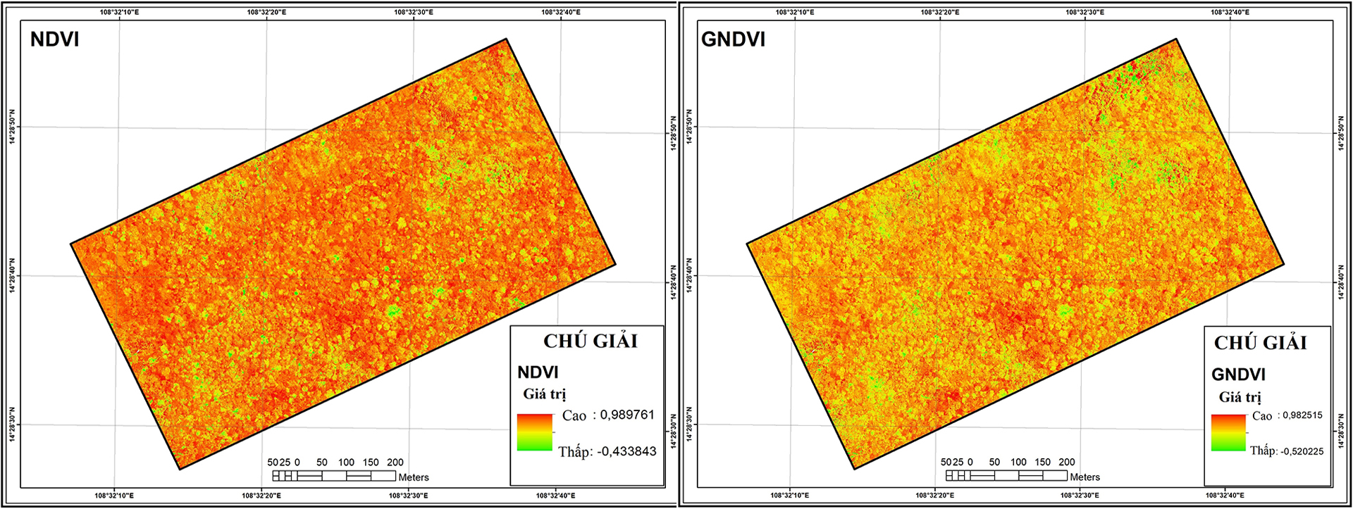 Bản đồ chỉ số thực vật NDVI và GNDVI phân tích từ dữ liệu UAV đa phổ